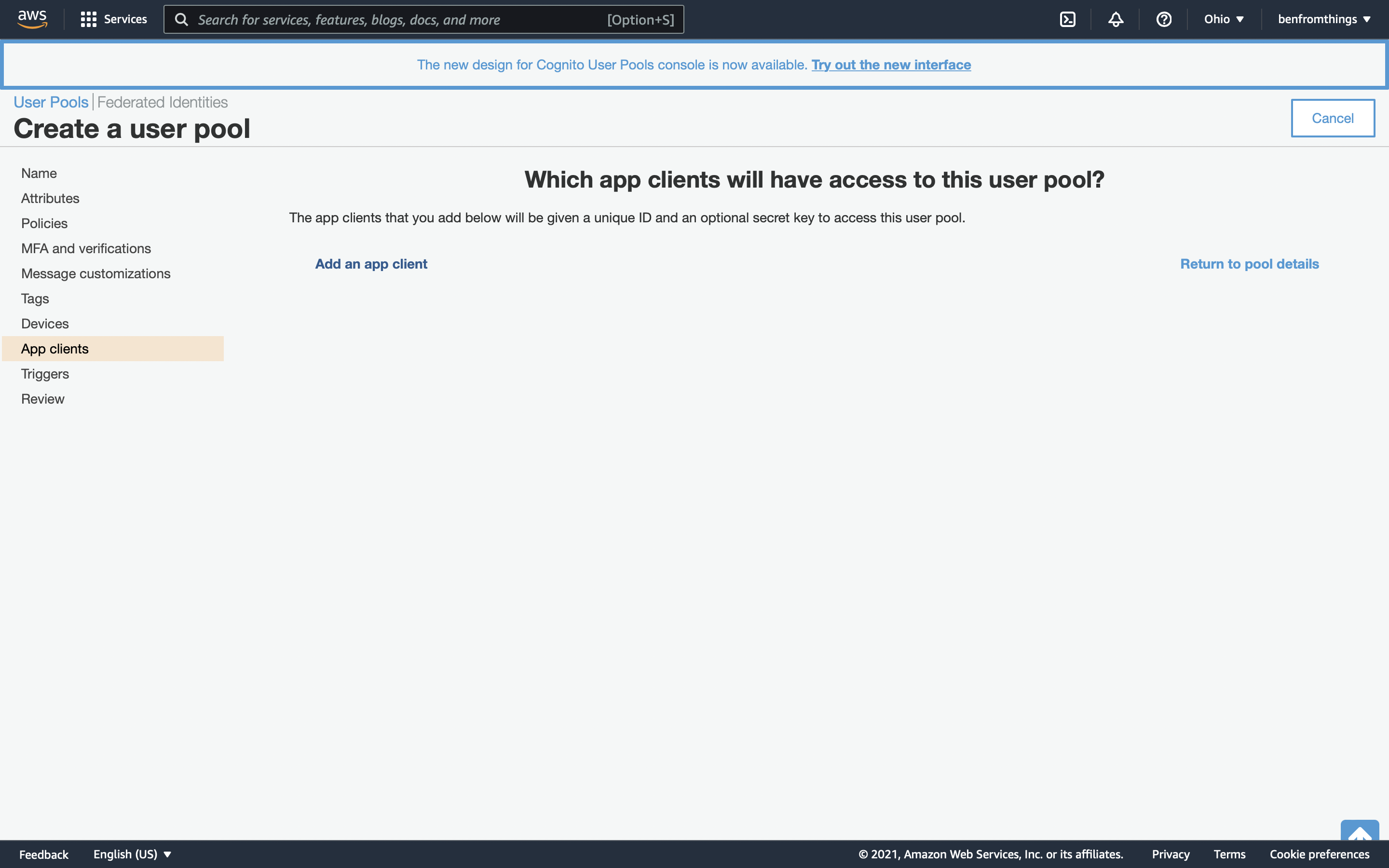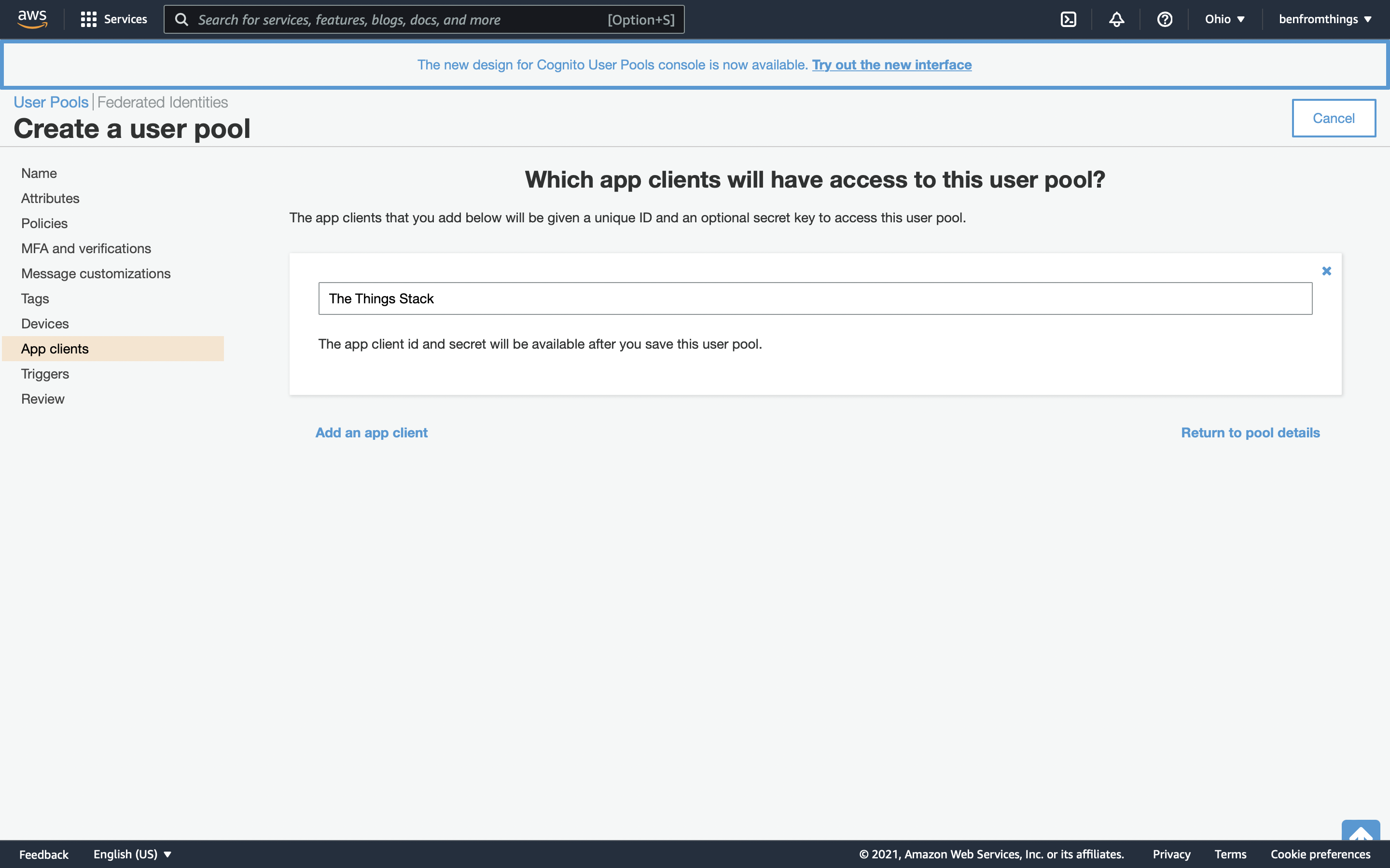 You will be taken back to the App Clients screen, where you should see the App Client you just added. Click Return to pool details.