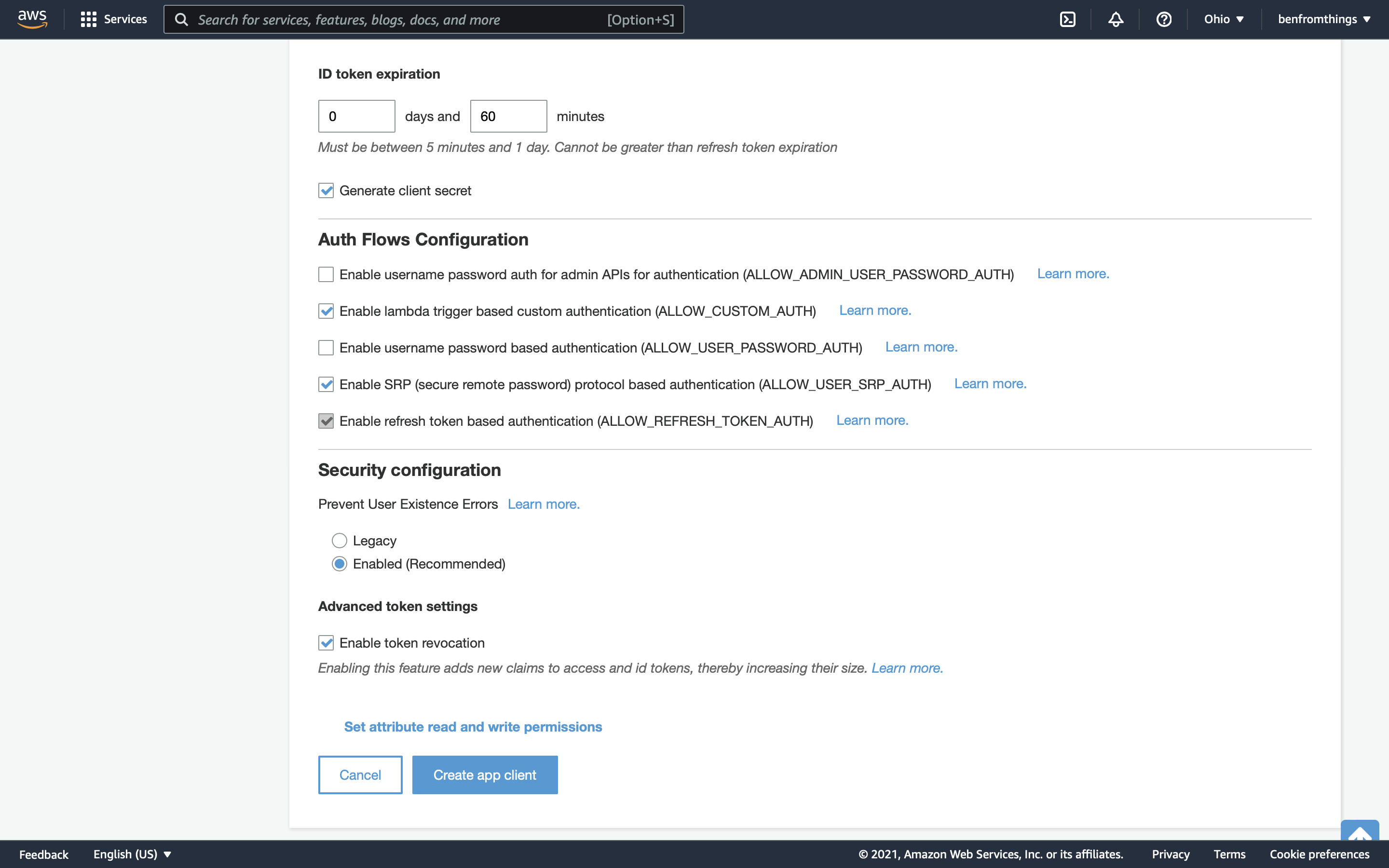 Give the App Client a name and leave all settings default. Click Create app client.
