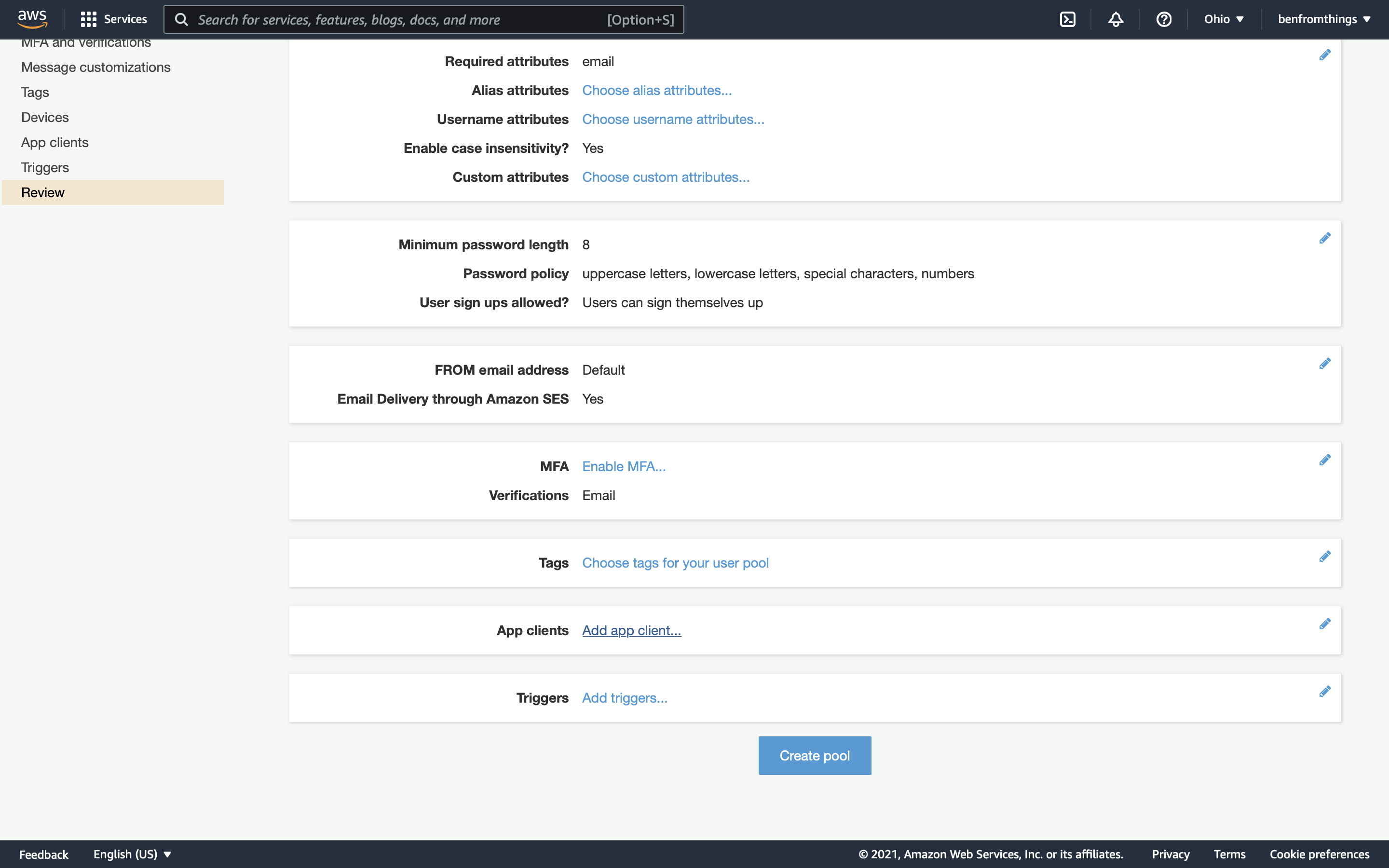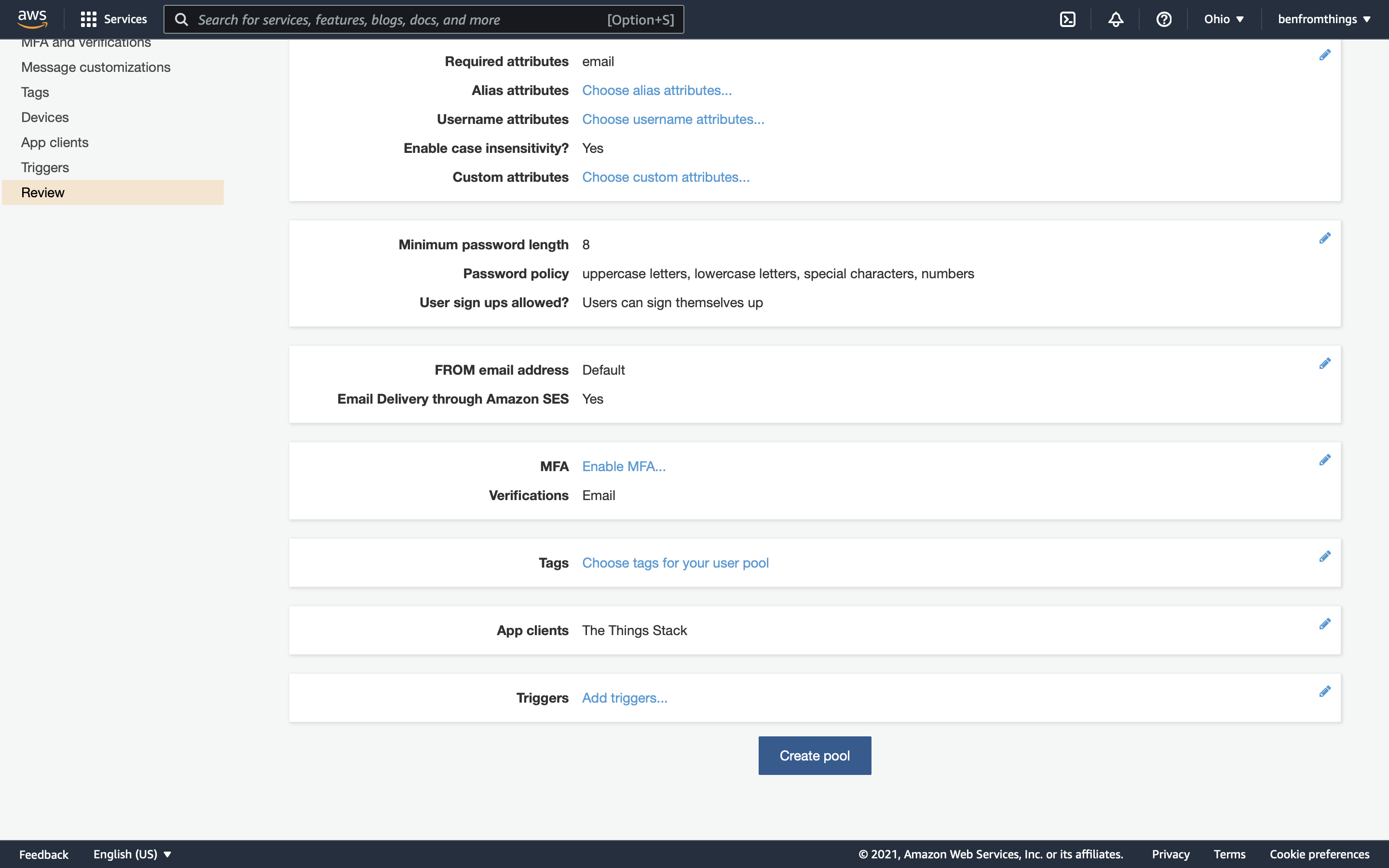 Verify that the App Client you added is listed in the pool. Click Create pool.
