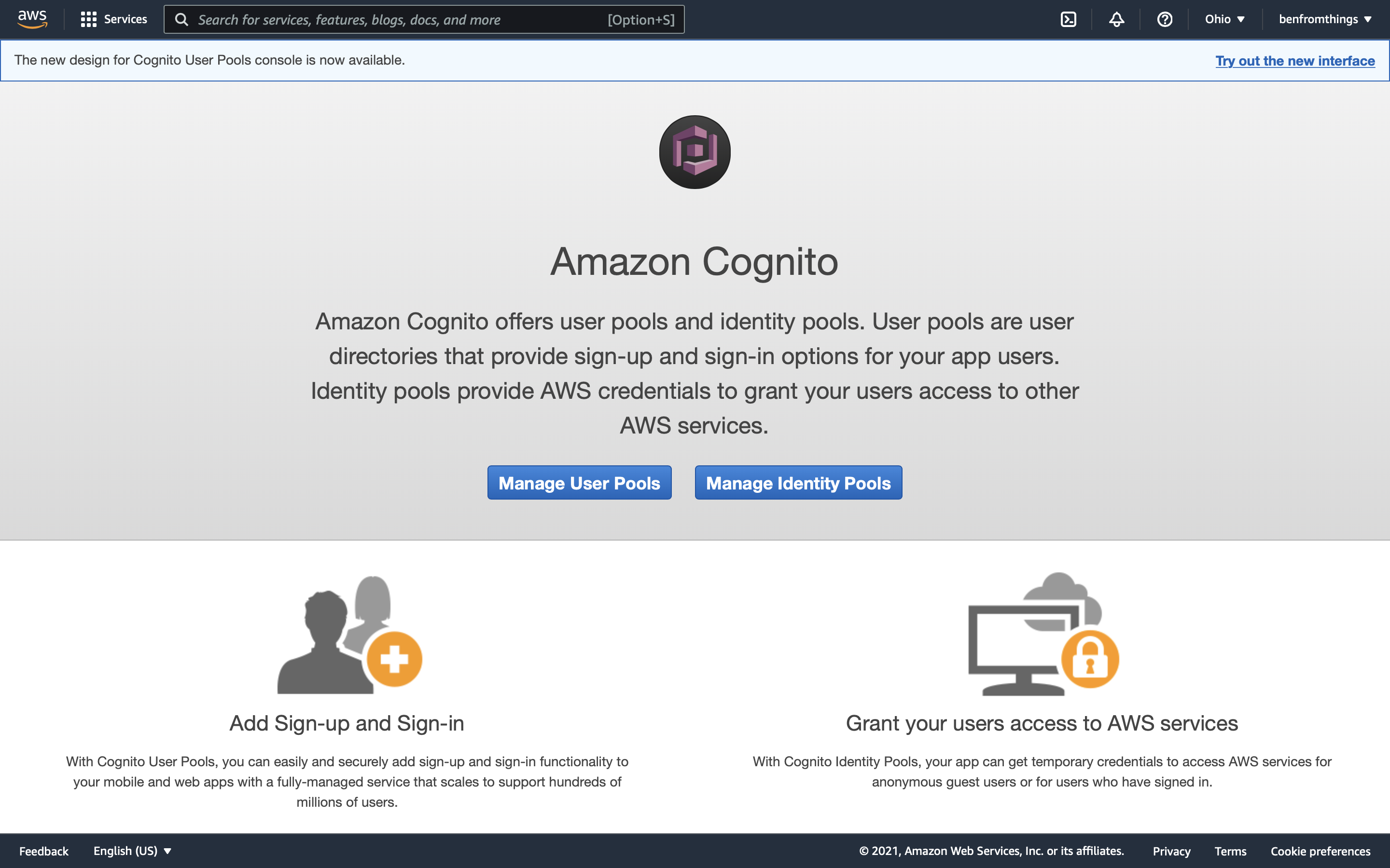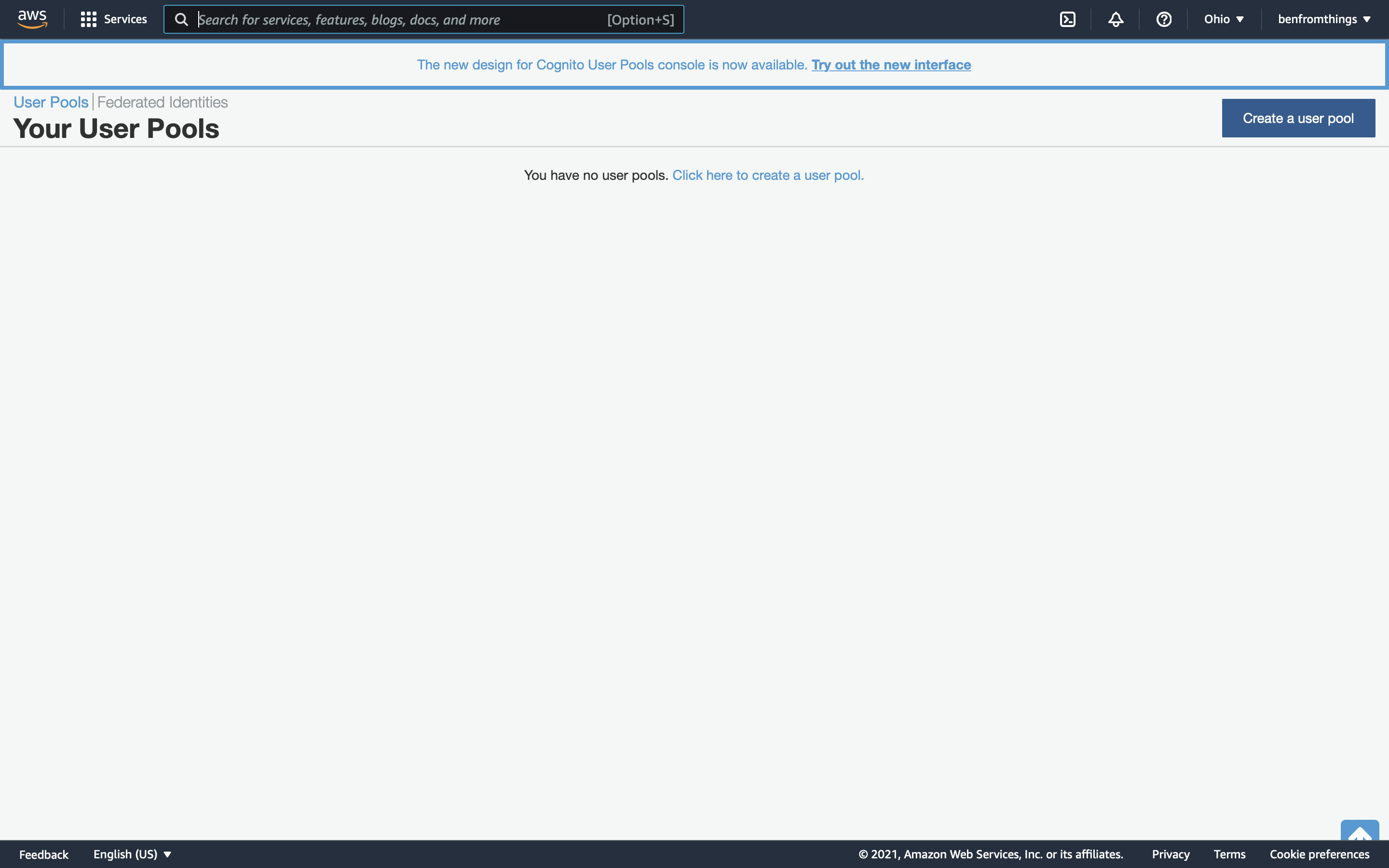 Click Create a user pool in the top right.