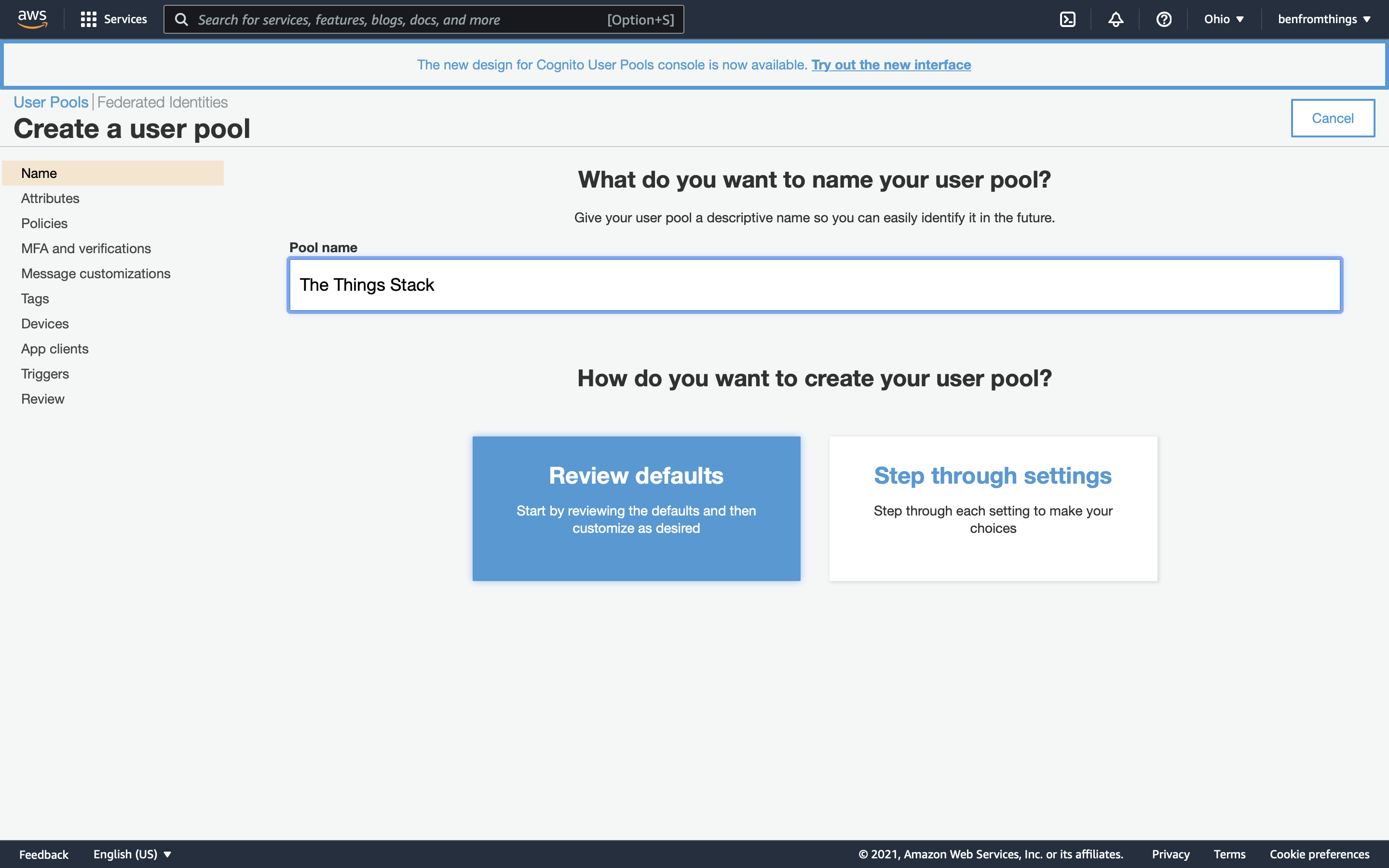 Give the user pool a name of your choosing. You will not need this later, you may pick any name.
